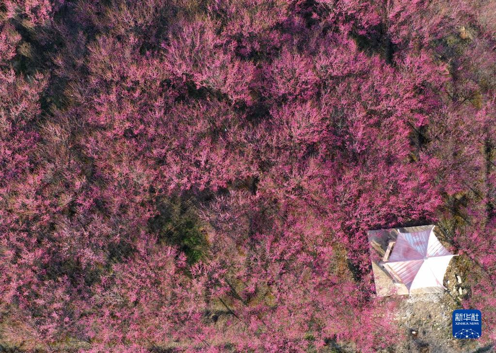 早春時節,位于安徽省巢湖市廟崗鎮清水灣梅花園的千畝梅花相繼盛開,朵朵梅花如霞似火,吸引人們徜徉花海,感受春日的美好。