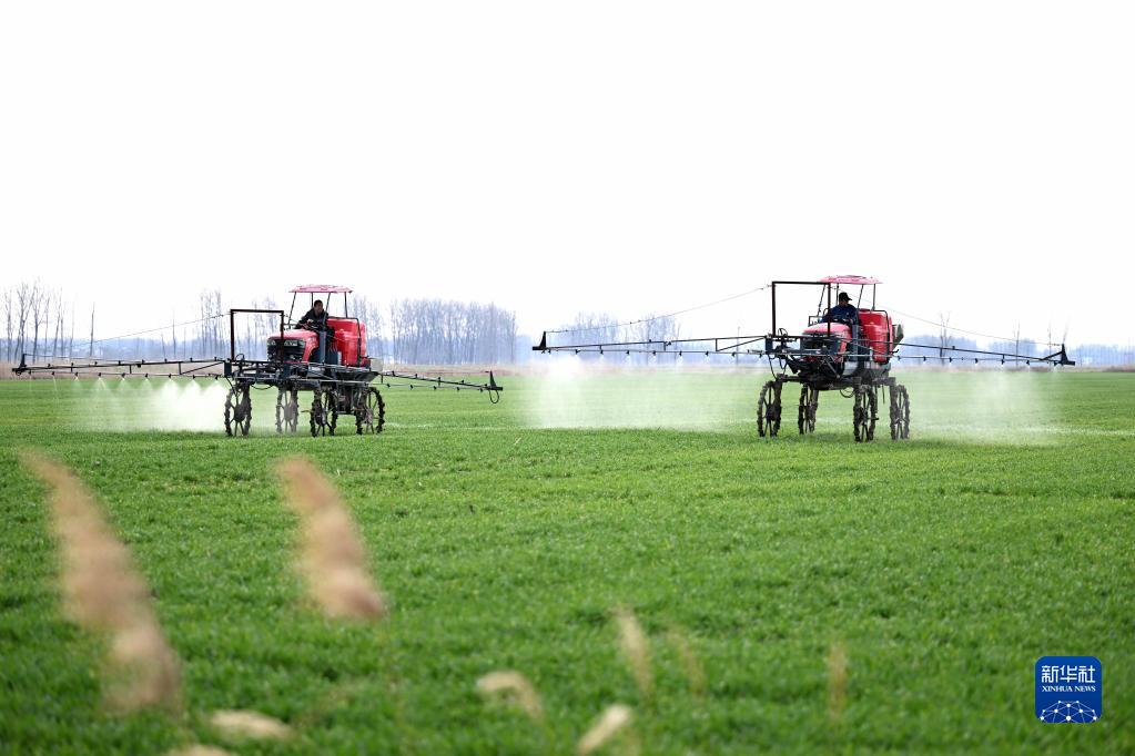 2月14日,在安徽省蚌埠市五河縣頭鋪鎮(zhèn),農(nóng)民駕駛農(nóng)機(jī)給小麥噴灑農(nóng)藥。