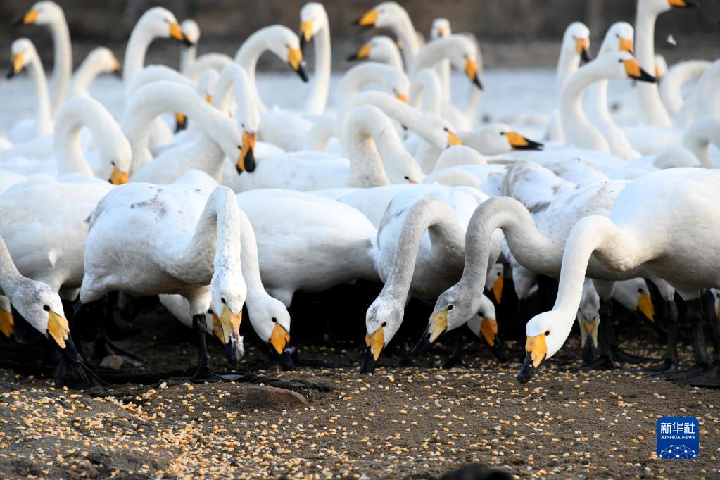 大天鵝在榮成市大天鵝國家級自然保護區一處食物投放點進食(2月14日攝)。