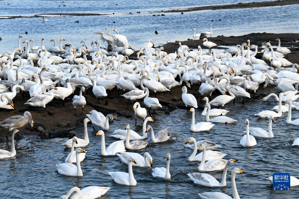 大天鵝在榮成市大天鵝國家級自然保護區一處食物投放點等候進食(2月14日攝)。