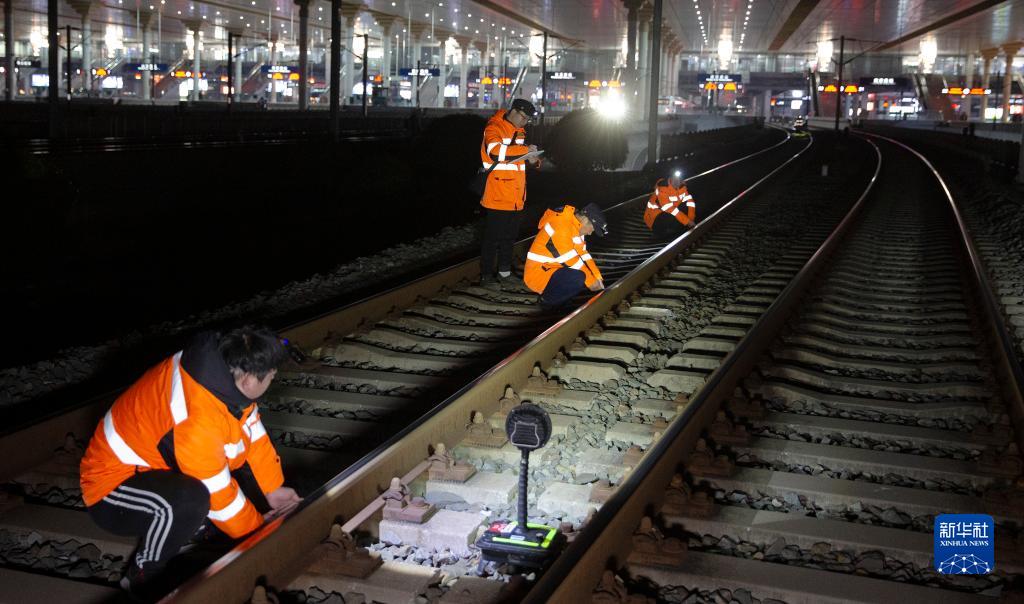 2月15日凌晨,中國鐵路上海局集團(tuán)有限公司南京橋工段的鐵路檢修人員在南京南站對(duì)線路進(jìn)行檢測(cè)。