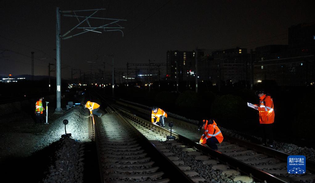 2月15日凌晨,中國鐵路上海局集團有限公司南京橋工段的鐵路檢修人員在南京南站對線路進行檢測。