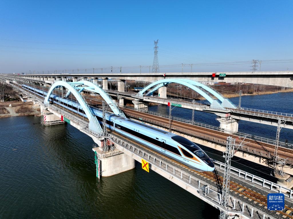 2月15日,列車駛過江蘇省連云港市海州區境內的一座鐵路橋(無人機照片)。
