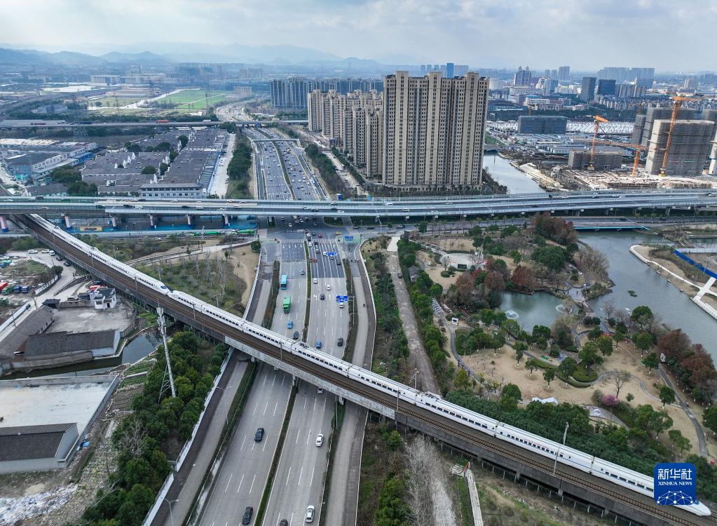 2月15日,列車行駛在浙江省寧波市鄞州區境內(無人機照片)。
