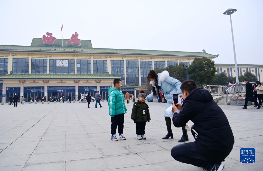 2月15日,旅客在西安站站前廣場拍照留念。