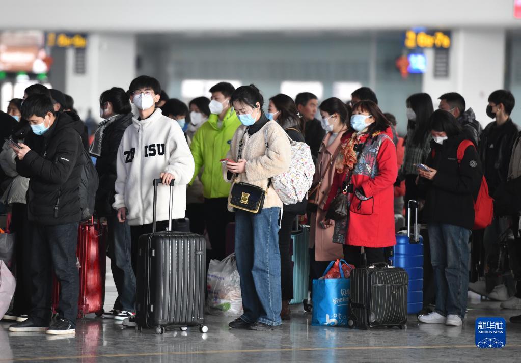 2月15日,旅客在安徽阜陽西站等待檢票。