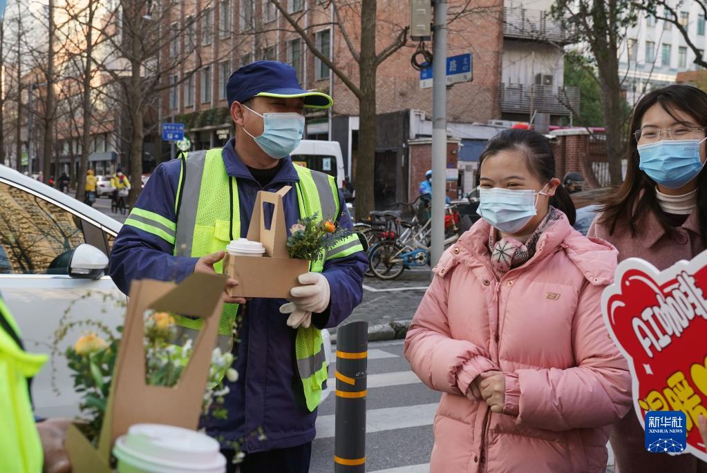 2月15日,收到咖啡和花的環衛工人與黃浦區特殊教育職業學校的師生交流。