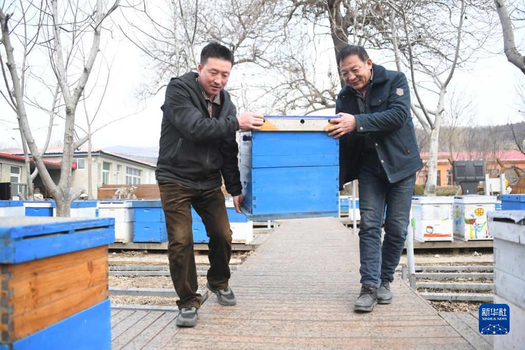2月15日,在北京市峪口鎮的一處蜜蜂養殖基地,工作人員將蜂箱從室內搬出,以便蜜蜂調整身體狀況,為繁殖做好準備。