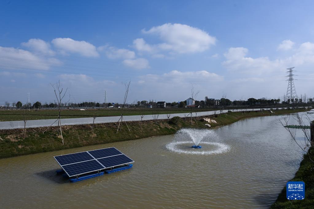 這是在浙江省嘉興市南湖區鳳橋鎮星火村的一個綠色農田建設項目現場拍攝的依托太陽能運行的稻田退水零直排設施(2月15日攝)。