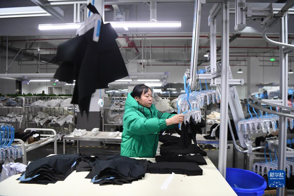 2月15日,工人在湖南尊睿服飾有限公司將裁片掛上自動吊掛系統。自動吊掛系統可自動將裁片送往下一道工序。