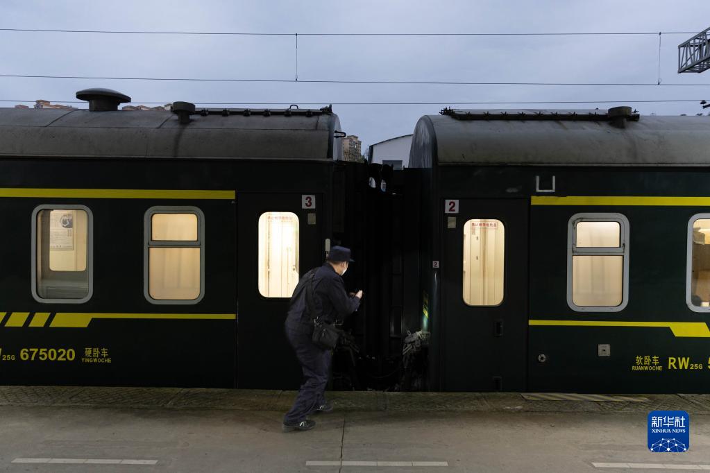 2月13日,列車在南充站停靠期間,車輛乘務員李金文檢查車廂間連接裝置。