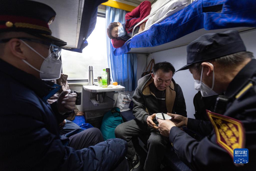 2月14日,車輛乘務員李金文(右一)在照顧一名身體不適的乘客。