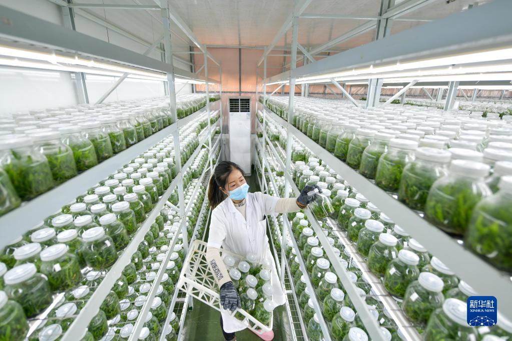 2月14日,工人在貴州省從江縣貫洞鎮鐵皮石斛育苗基地的組培室里管護鐵皮石斛苗。
