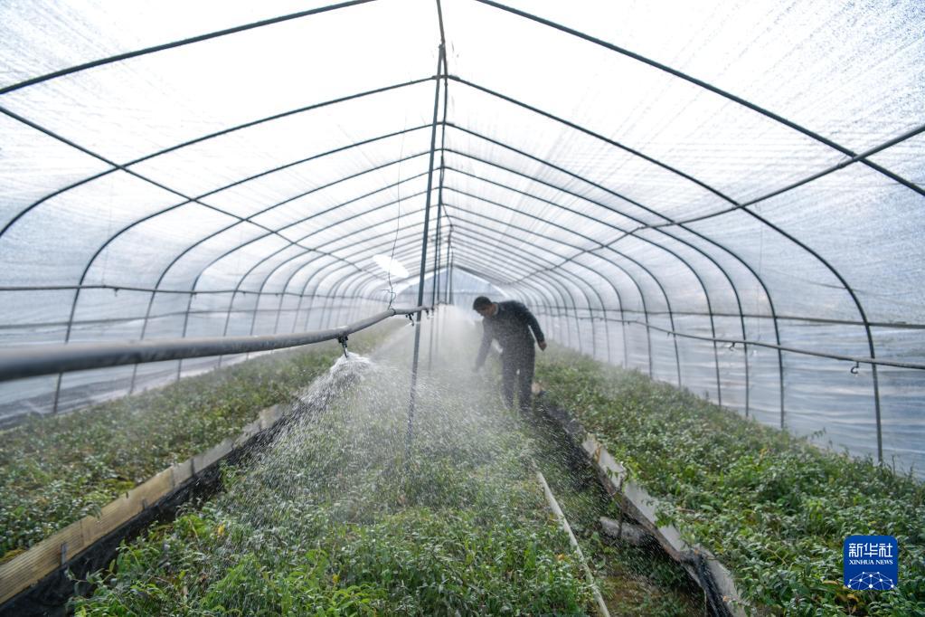 2月14日,在貴州省從江縣貫洞鎮鐵皮石斛育苗基地,工人利用自動噴灌系統給鐵皮石斛苗澆水。