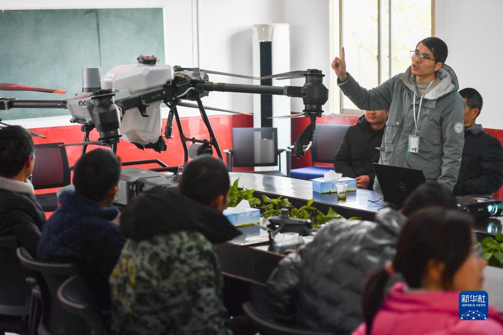 2月15日,在沅江市共華鎮(zhèn)福安村,老師在農(nóng)業(yè)植保無(wú)人機(jī)操作員培訓(xùn)班上講解無(wú)人機(jī)的構(gòu)造。