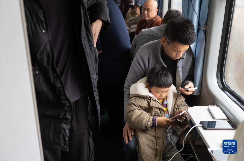 2月14日,在臨客K4618次列車上,一對父子在看手機。
