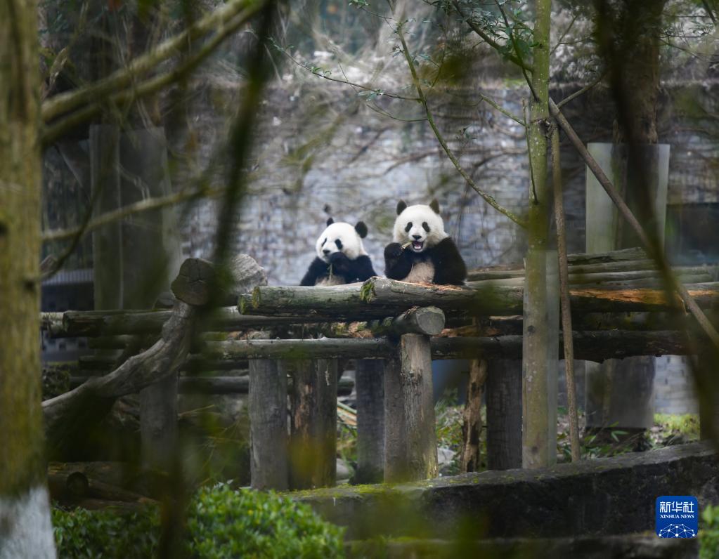 2月15日,在中國(guó)大熊貓保護(hù)研究中心都江堰基地,大熊貓?jiān)诔灾褡印?/p>