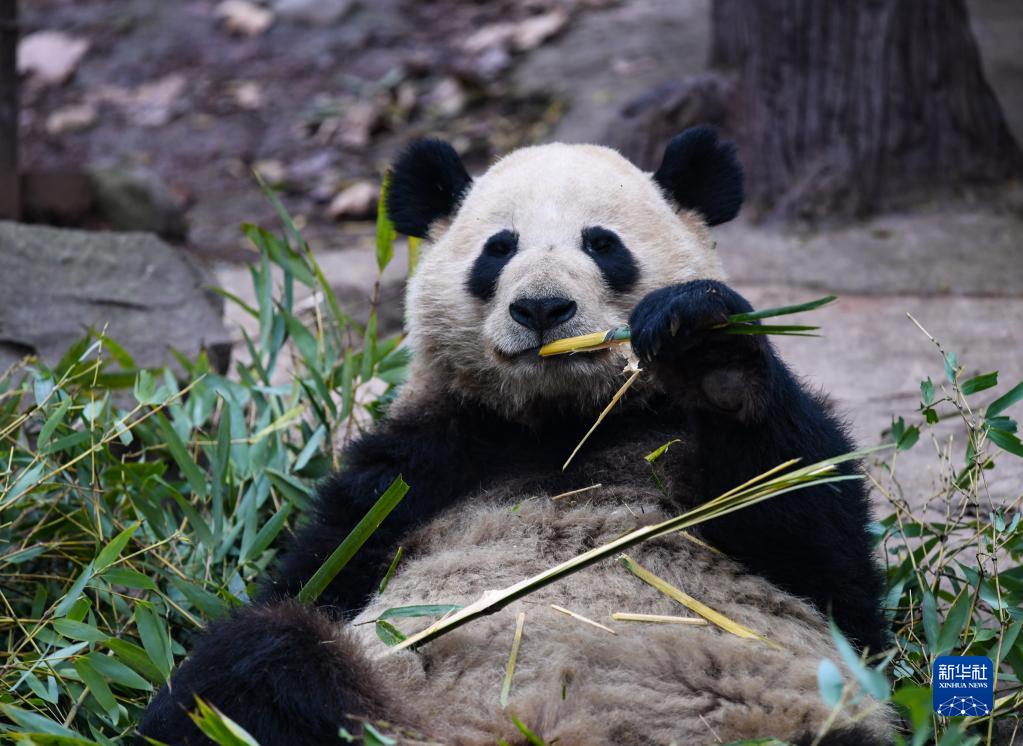 2月15日,在中國大熊貓保護研究中心都江堰基地,大熊貓在吃竹子。
