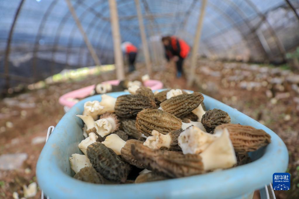 2月15日,在湖南省衡陽市衡陽縣渣江鎮三馬新村,村民在大棚里采收羊肚菌。