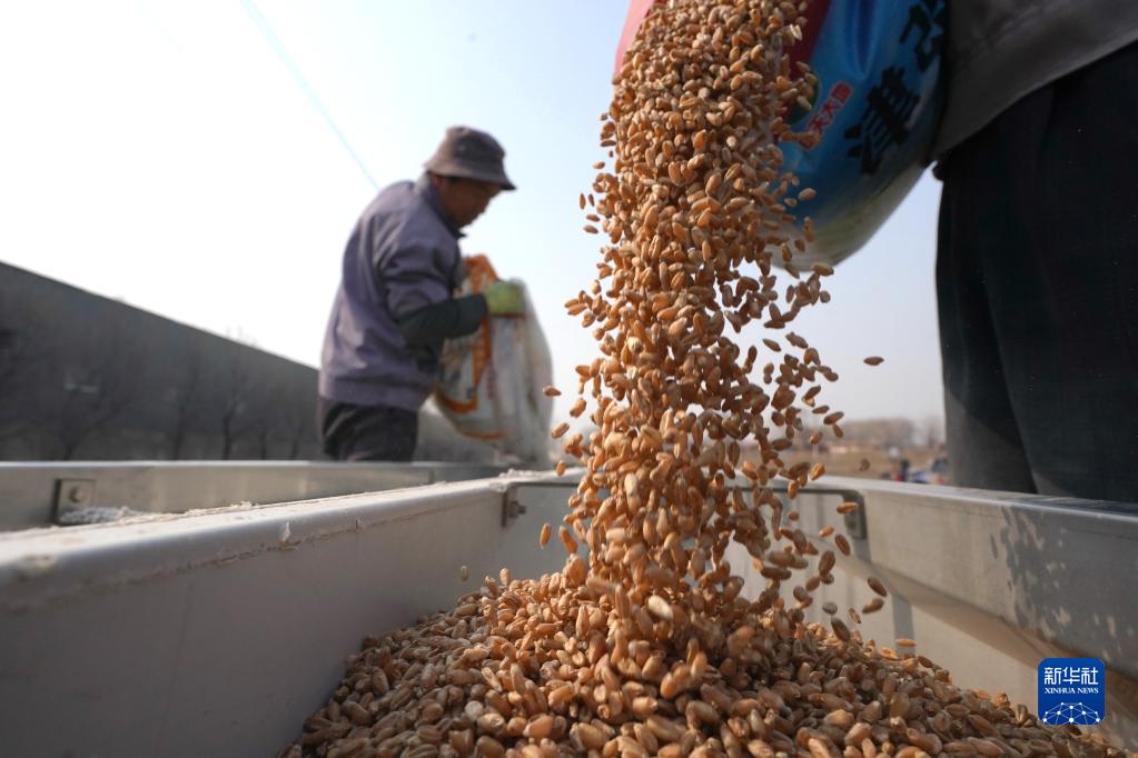 2月16日,唐山市蘆臺經濟開發區海北鎮小海北村農民將備好的小麥種子、肥料一起放進播種機。