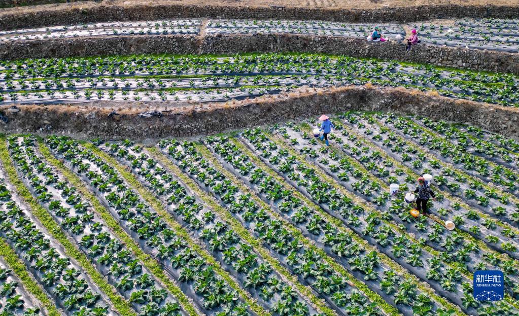 2月15日,村民在貴州省從江縣洛香鎮上皮林村田間管護蔬菜(無人機照片)。