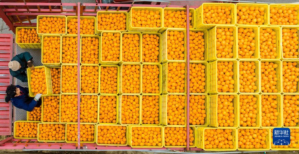 2月15日,秭歸縣歸州鎮(zhèn)香溪村村民將剛收獲的紅肉臍橙進行裝車(無人機照片)。