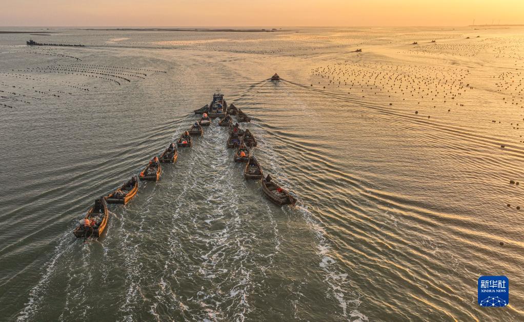 2月16日,在榮成市石島管理區(qū)桑溝灣海洋牧場網(wǎng)箱養(yǎng)殖區(qū),漁民駕駛漁船出海作業(yè)(無人機照片)。