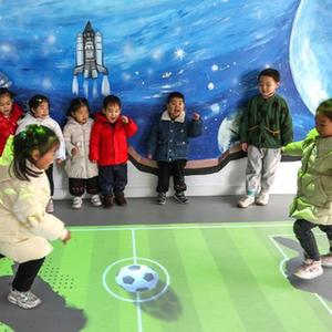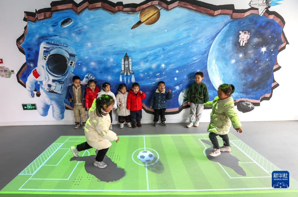 2月15日,在常州市新北區(qū)龍虎塘街道中心幼兒園(盤龍新區(qū))游戲共享部落,小朋友們在進(jìn)行模擬足球?qū)官愑螒颉?/p>