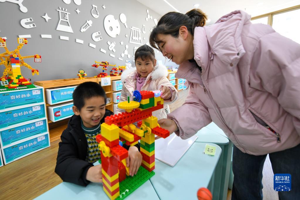 2月15日,在常州市新北區(qū)龍虎塘街道中心幼兒園(盤龍新區(qū)),小朋友們在老師的指導(dǎo)下拼搭積木。