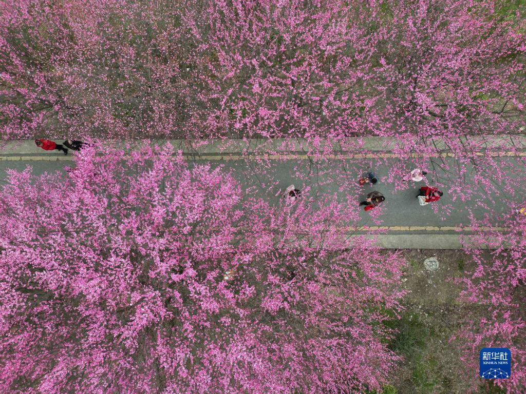 2月15日,在貴州省遵義市余慶縣都市第三地生態園,游客在梅花園游玩(無人機照片)。