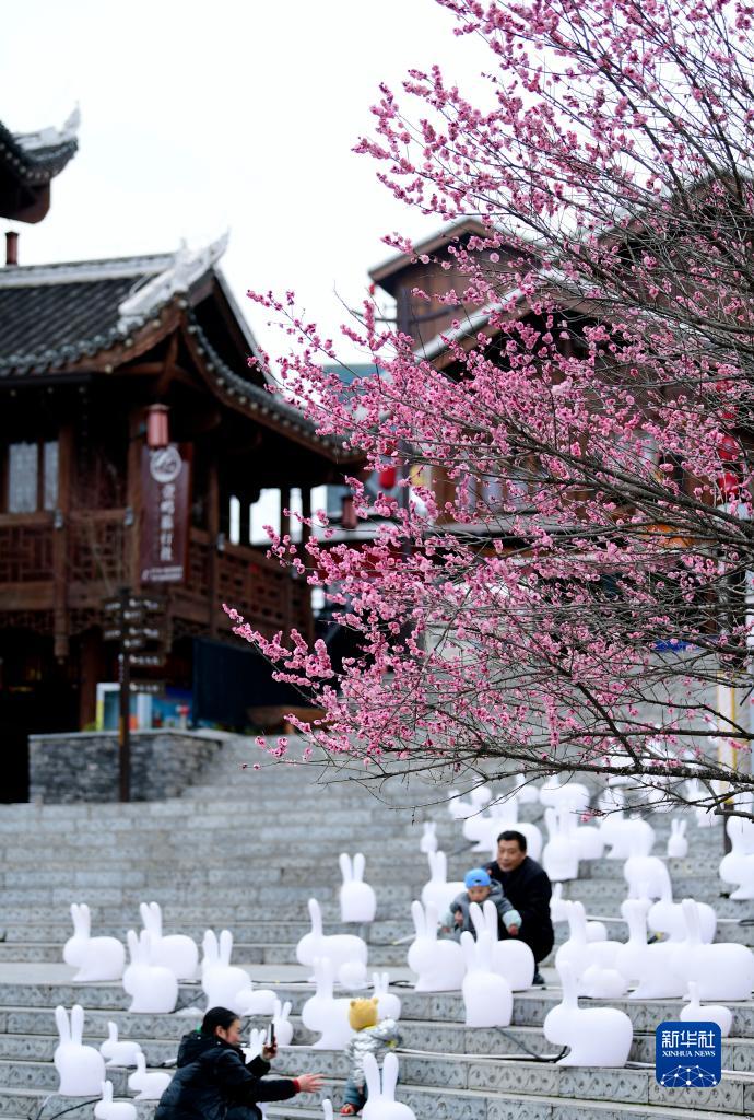 2月15日,在湖北省宣恩縣城興隆老街,人們在梅花掩映下的吊腳樓前游玩。