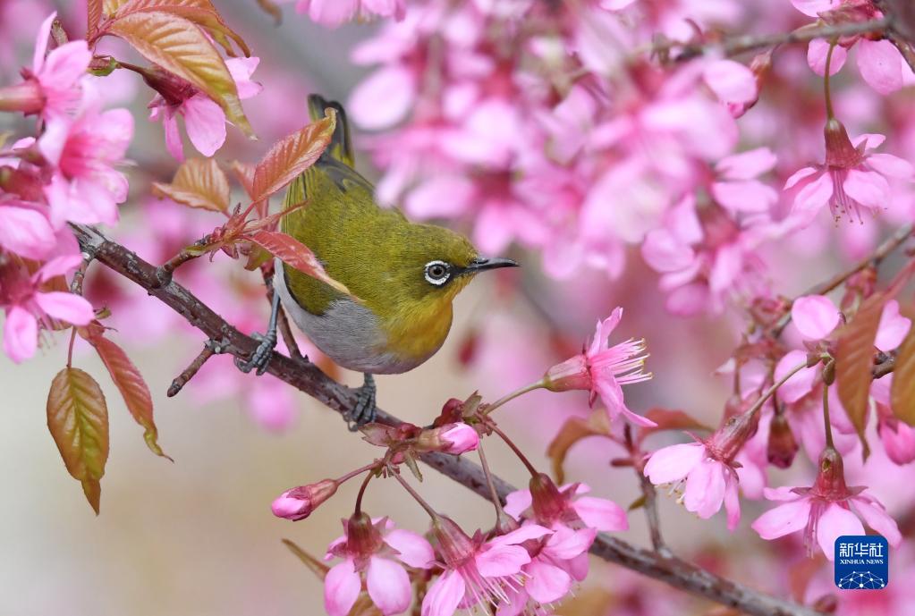 2月15日,繡眼鳥在貴陽市南明河畔水東路段的冬櫻花樹花枝間覓食啄花。