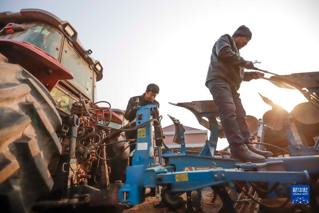 2月16日,農民在遵化市西留村鎮的一家農機服務專業合作社檢修旋耕機。