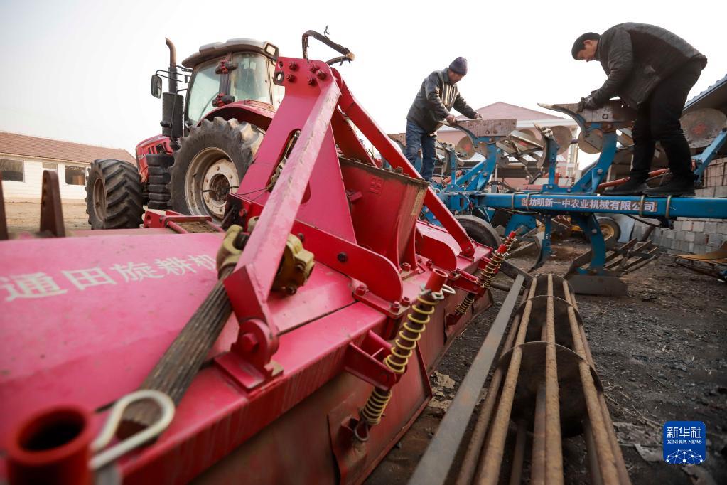 2月16日,農民在遵化市西留村鎮的一家農機服務專業合作社檢修旋耕機。