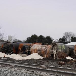 這是2月14日在美國俄亥俄州東巴勒斯坦鎮拍攝的脫軌列車殘骸。