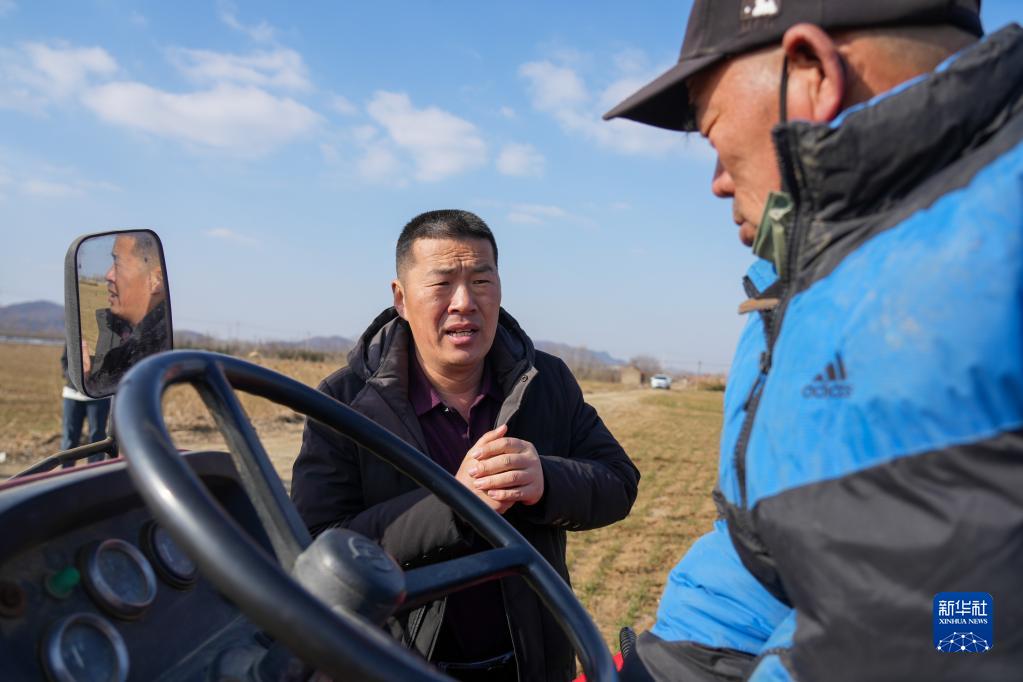 2月15日,山東省威海市文登區(qū)金農(nóng)會農(nóng)業(yè)專業(yè)合作社負責人于進海和農(nóng)機手討論施肥方案。