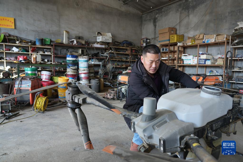 2月15日,山東省威海市文登區金農會農業專業合作社負責人于進海在檢修農業無人機。