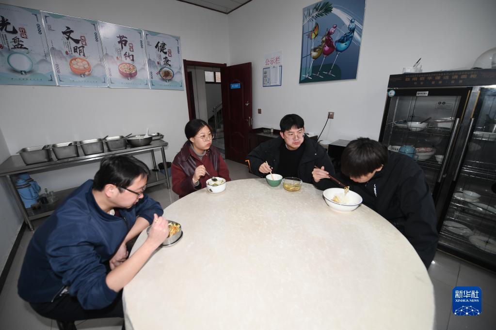 楊鑫博(左二)和同事在項(xiàng)目部食堂吃飯(2月15日攝)。