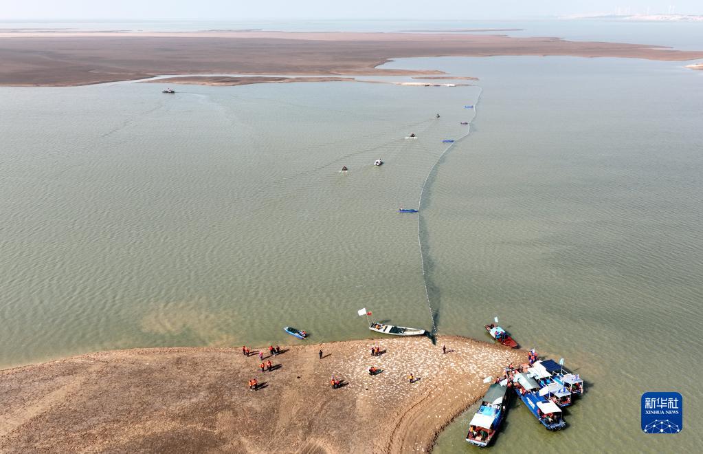 在江西鄱陽湖松門山水域,工作人員用快艇和漁船合圍江豚(2月15日攝,無人機照片)。