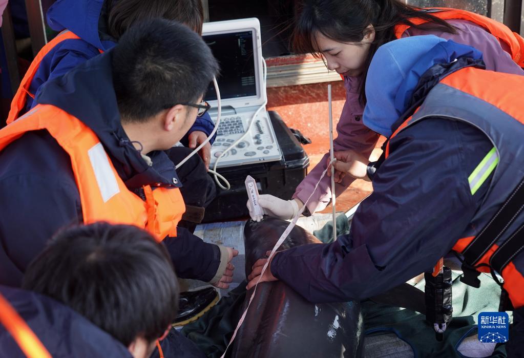 在江西鄱陽湖松門山水域,科研人員在船上為江豚進行體檢(2月15日攝)。