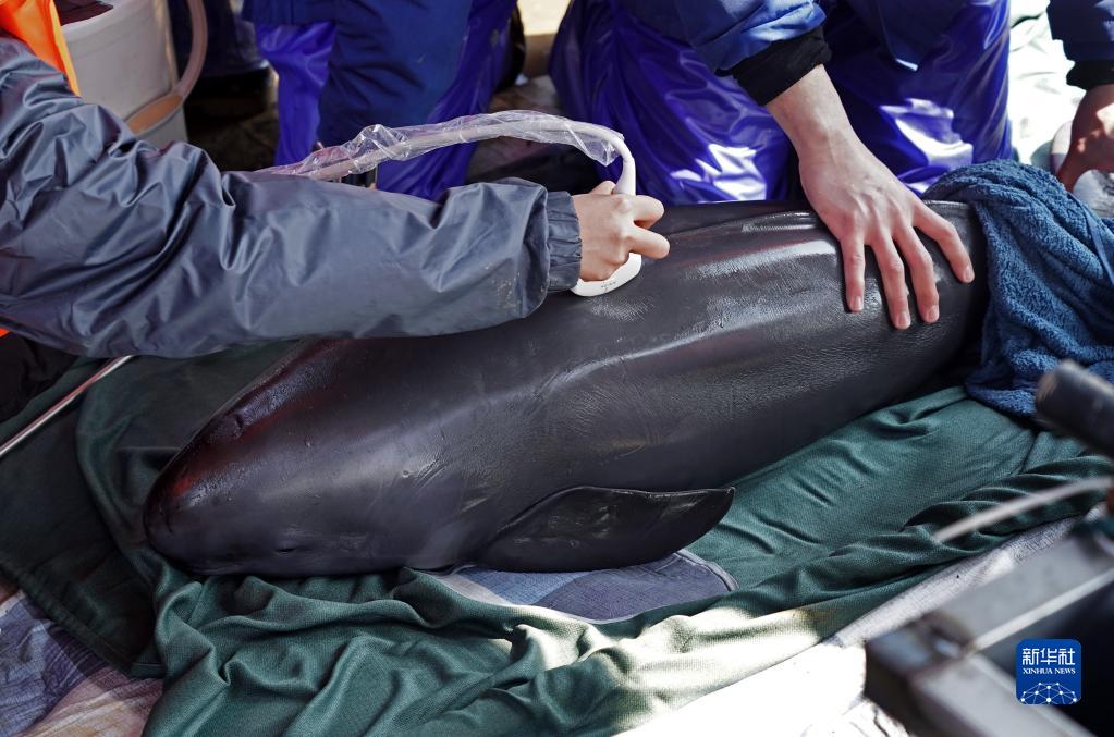 在江西鄱陽湖松門山水域,科研人員在船上為江豚進行體檢(2月15日攝)。