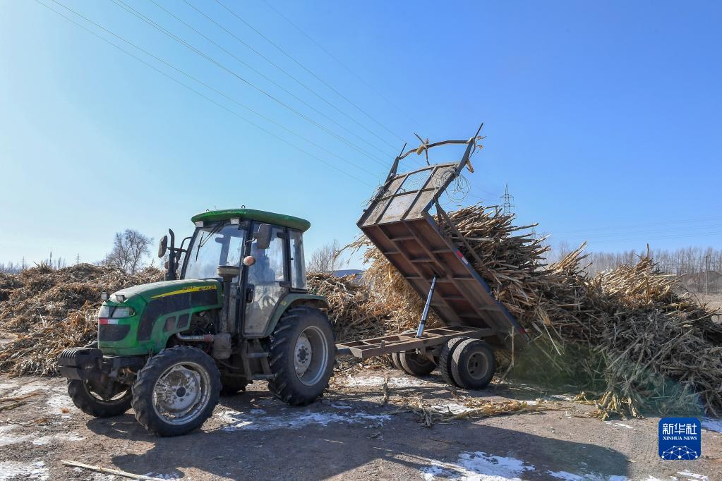 2月16日,在吉林省長(zhǎng)春市九臺(tái)區(qū)東湖街道腰站村,隆達(dá)興養(yǎng)殖農(nóng)民專(zhuān)業(yè)合作社農(nóng)民將玉米秸稈卸到場(chǎng)院。