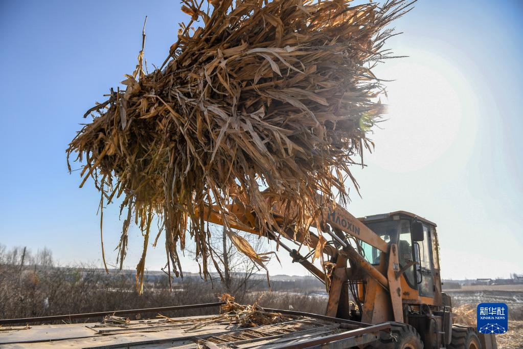 2月16日,在吉林省長春市九臺區東湖街道腰站村,隆達興養殖農民專業合作社農民操作農機將玉米秸稈裝車。