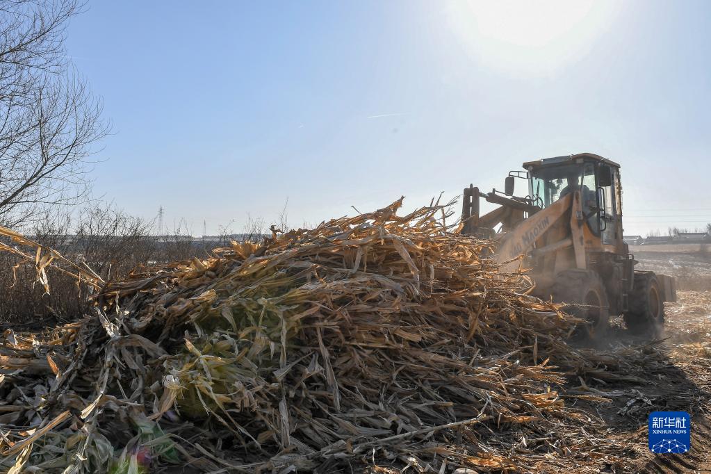 2月16日,在吉林省長春市九臺區東湖街道腰站村,隆達興養殖農民專業合作社農民操作農機整理玉米秸稈。