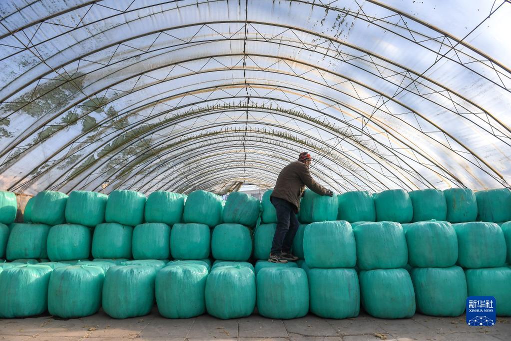 2月16日,在吉林省長春市九臺區東湖街道腰站村,隆達興養殖農民專業合作社農民整理玉米秸稈壓縮包。