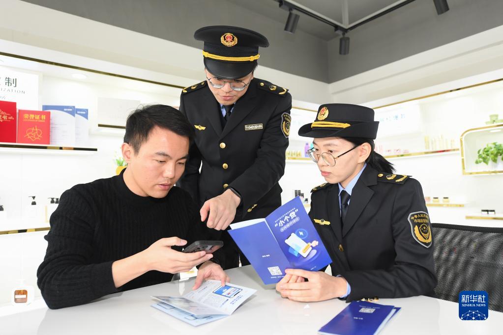 2月16日,在美妝小鎮一家小微化妝品企業,市場監管工作人員上門指導企業進行“信用修復”,幫助企業申請信用貸款。