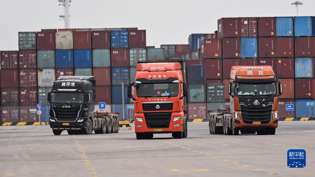 2月15日,貨車駛向欽州港集裝箱碼頭調運集裝箱。
