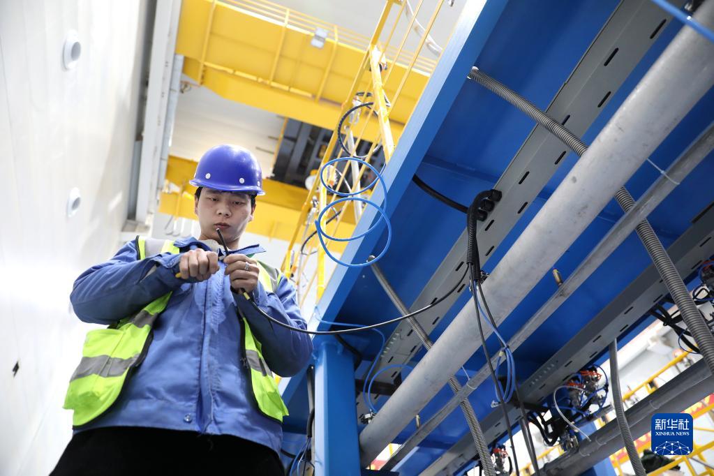 2月16日,工人在即將完工的特高壓套管研制基地內進行設備調試。