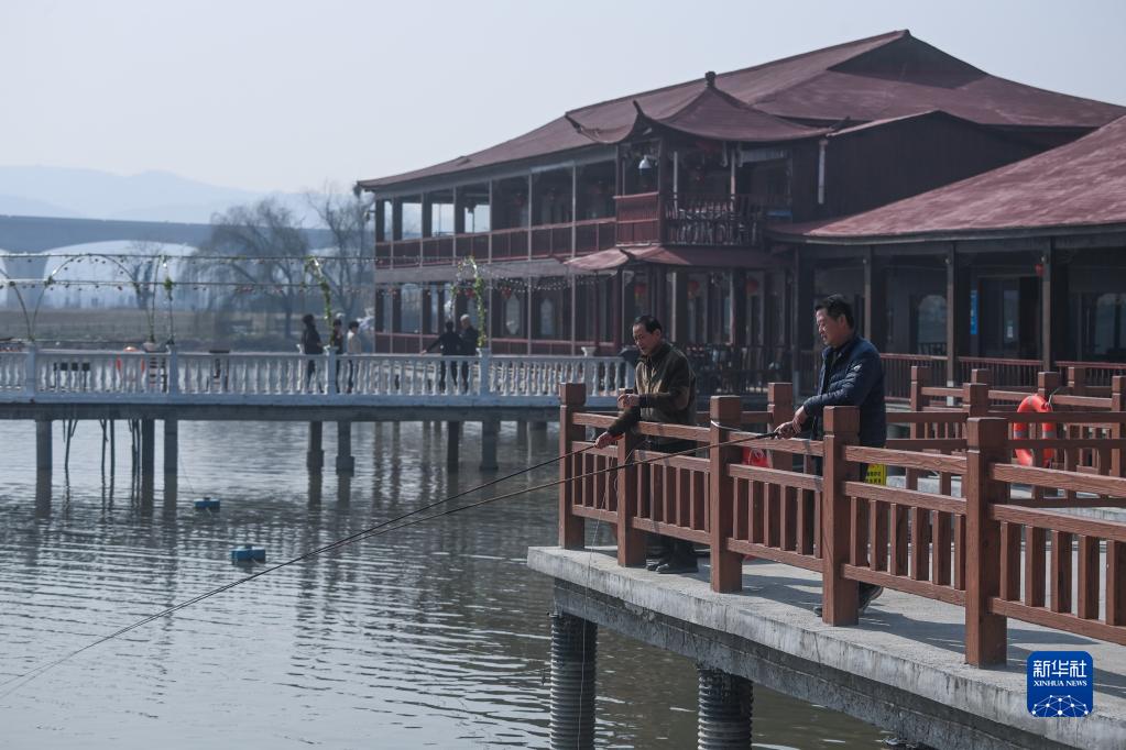 2月16日,游客在道場鄉道場浜村九里紅農莊的魚塘邊垂釣。該魚塘原來是一個廢棄礦坑。