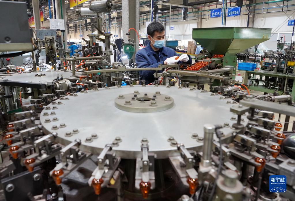 2月16日,在位于獻縣的滄州來福汽車照明集團燈泡車間,工人在生產線上工作。